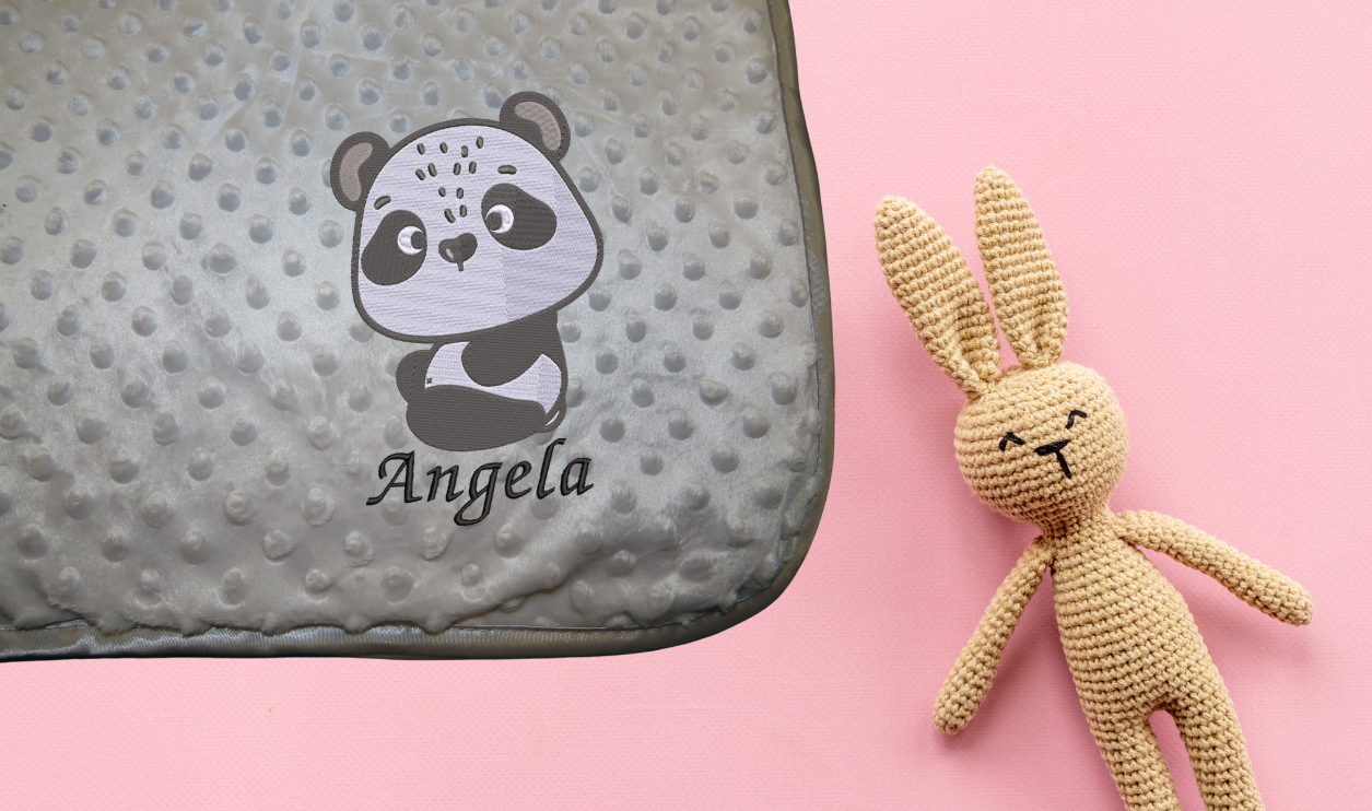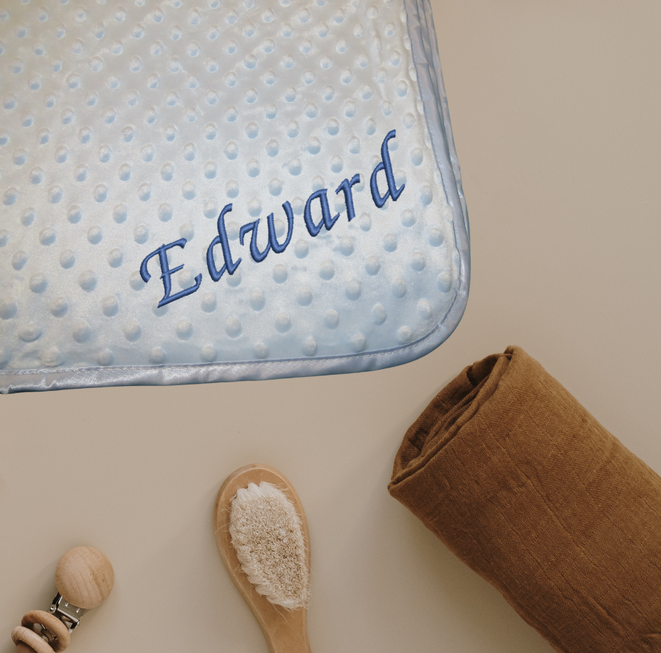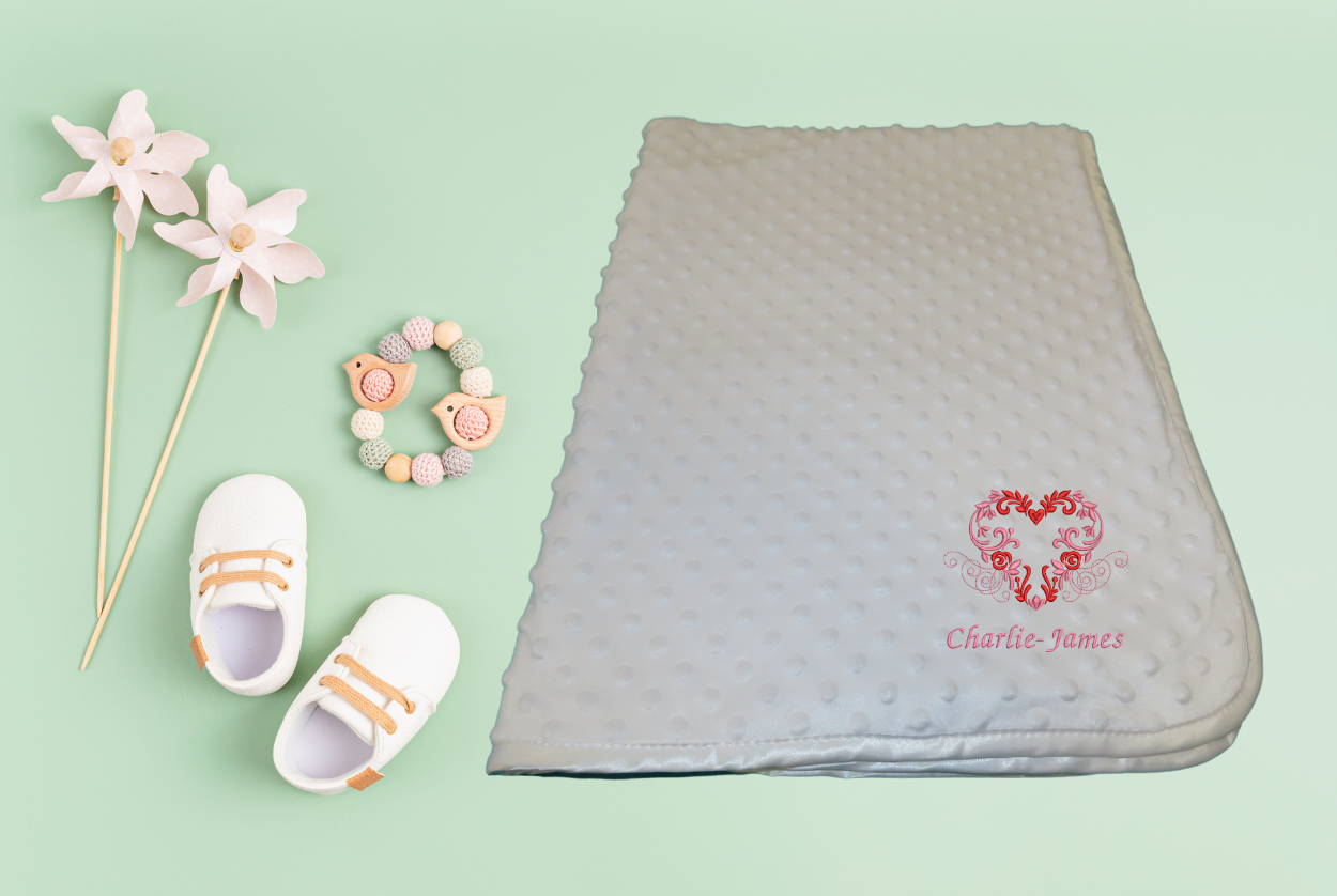 The Blanket can be personalised with the precious babies name placed in the corner (Up to 20 characters and we will match the writing to the best scale for the item so please be aware that if the name is long or hyphenated the writing will be smaller than a short name like Rosie). You can then add a design from the options available. The embroidery area is approx. 8x8cm.