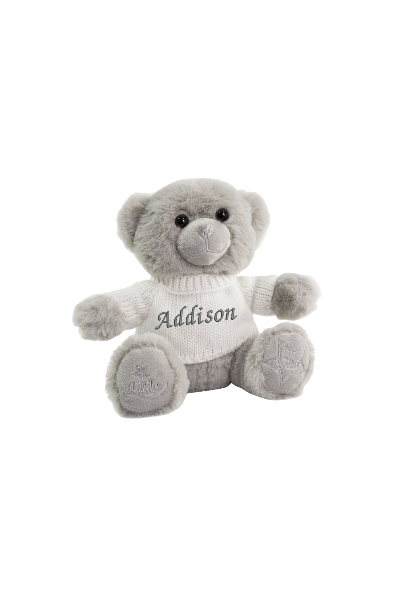 The Teddy can be personalised with the precious babies name placed on the jumper (Up to 20 characters and we will match the writing to the best scale for the item so please be aware that if the name is long or hyphenated the writing will be smaller than a short name like Rosie).