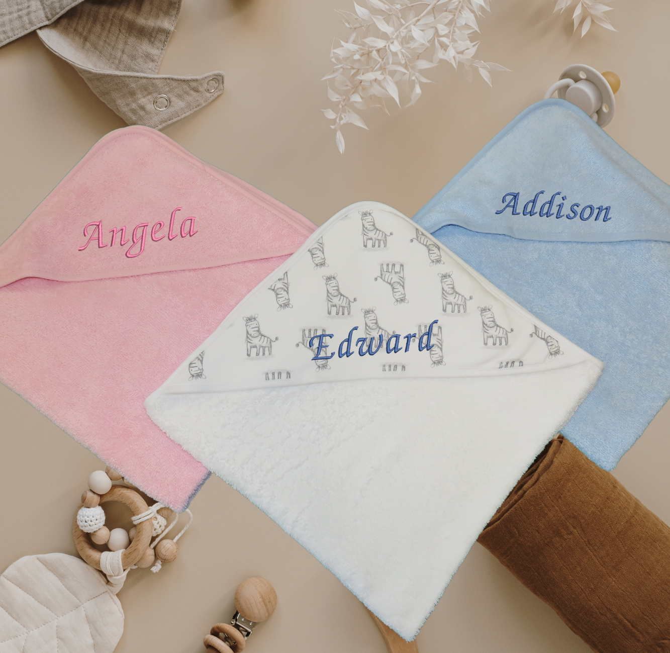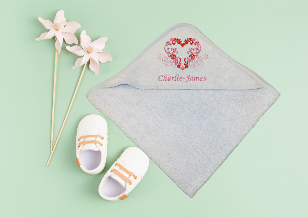 The Hooded Towel can be personalised with the precious babies name placed on the hood (Up to 20 characters and we will match the writing to the best scale for the item so please be aware that if the name is long or hyphenated the writing will be smaller than a short name like Rosie). You can then add a design from the options available. The embroidery area is approx. 8x8cm.