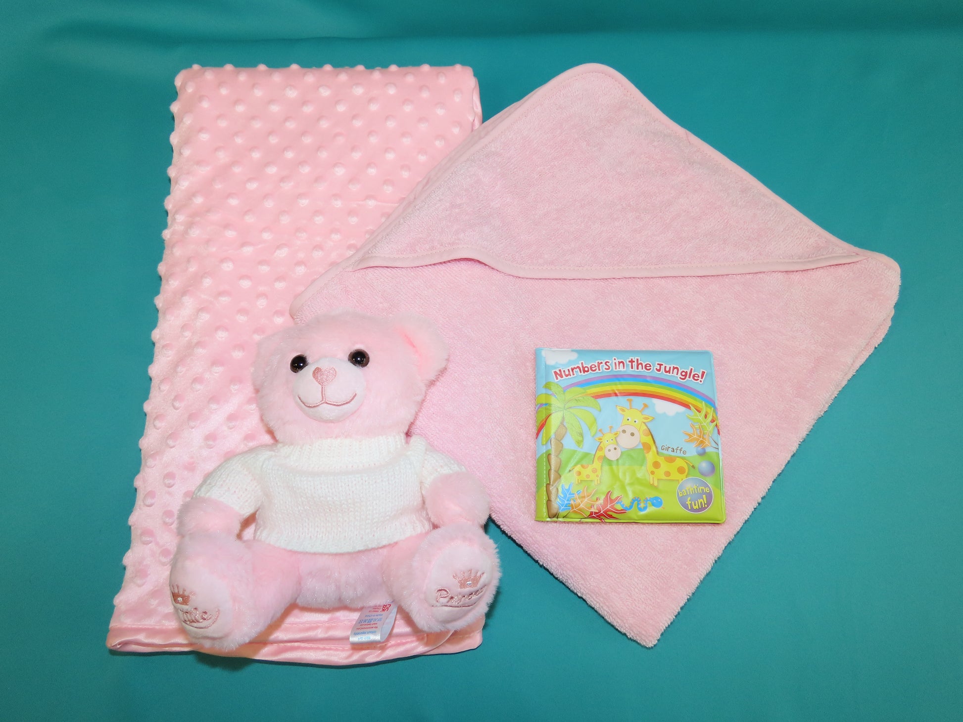Our personalised baby hooded towel and blankets are super soft for babies delicate skin and can be used for bath time and bed time routines. This set also includes a bath book and teddy.
