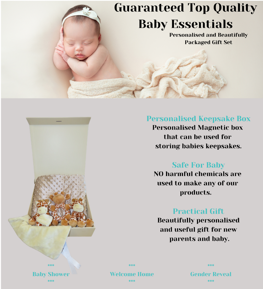 The Carter is a gorgeous gift set that is a lovely way to welcome a new precious baby into the world. Personalised blanket and comforter with other items are lovingly packaged in a beautiful, personalised keepsake box with a gift card with your personal message on, this is a beautiful gift for new parents and baby.