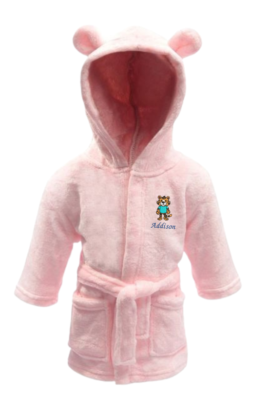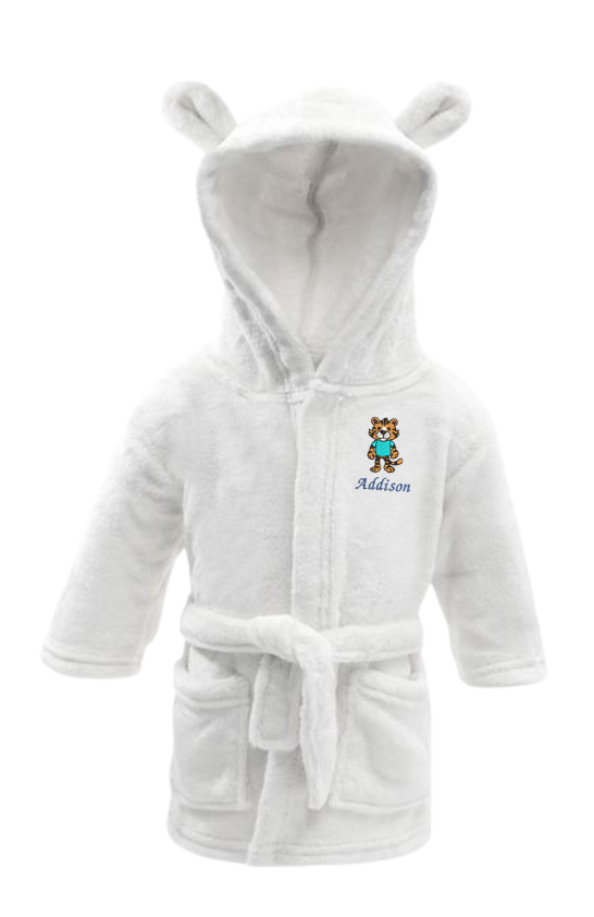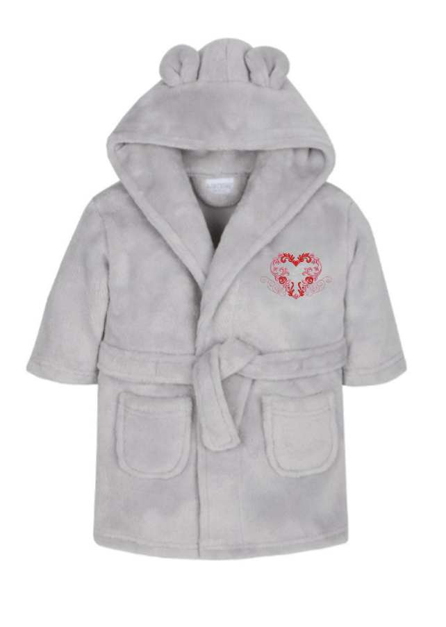 The Hooded Robe can be personalised with the precious babies name placed in the left (Up to 20 characters and we will match the writing to the best scale for the item so please be aware that if the name is long or hyphenated the writing will be smaller than a short name like Rosie). You can then add a design from the options available. The embroidery area is approx. 8x8cm.
