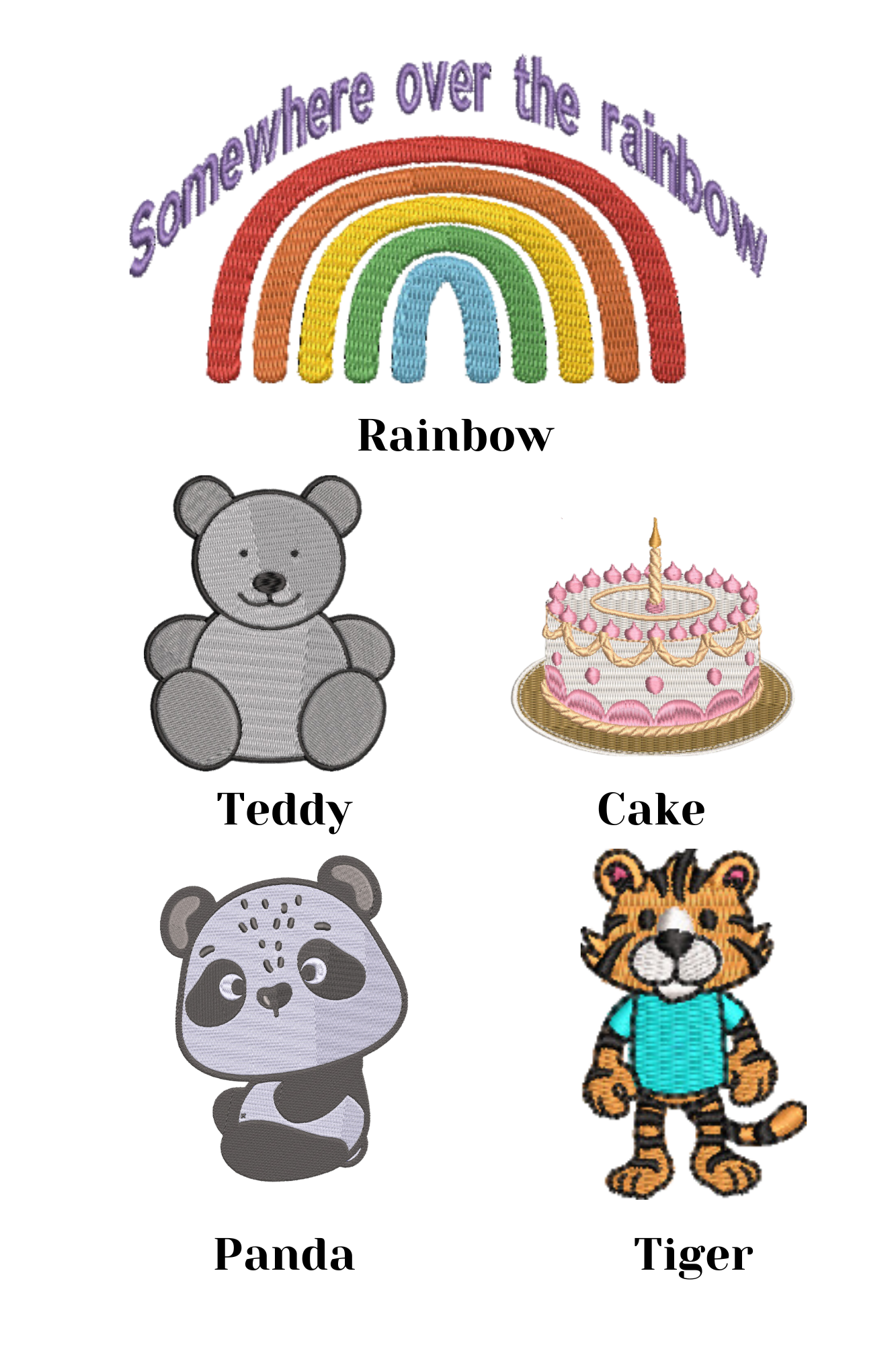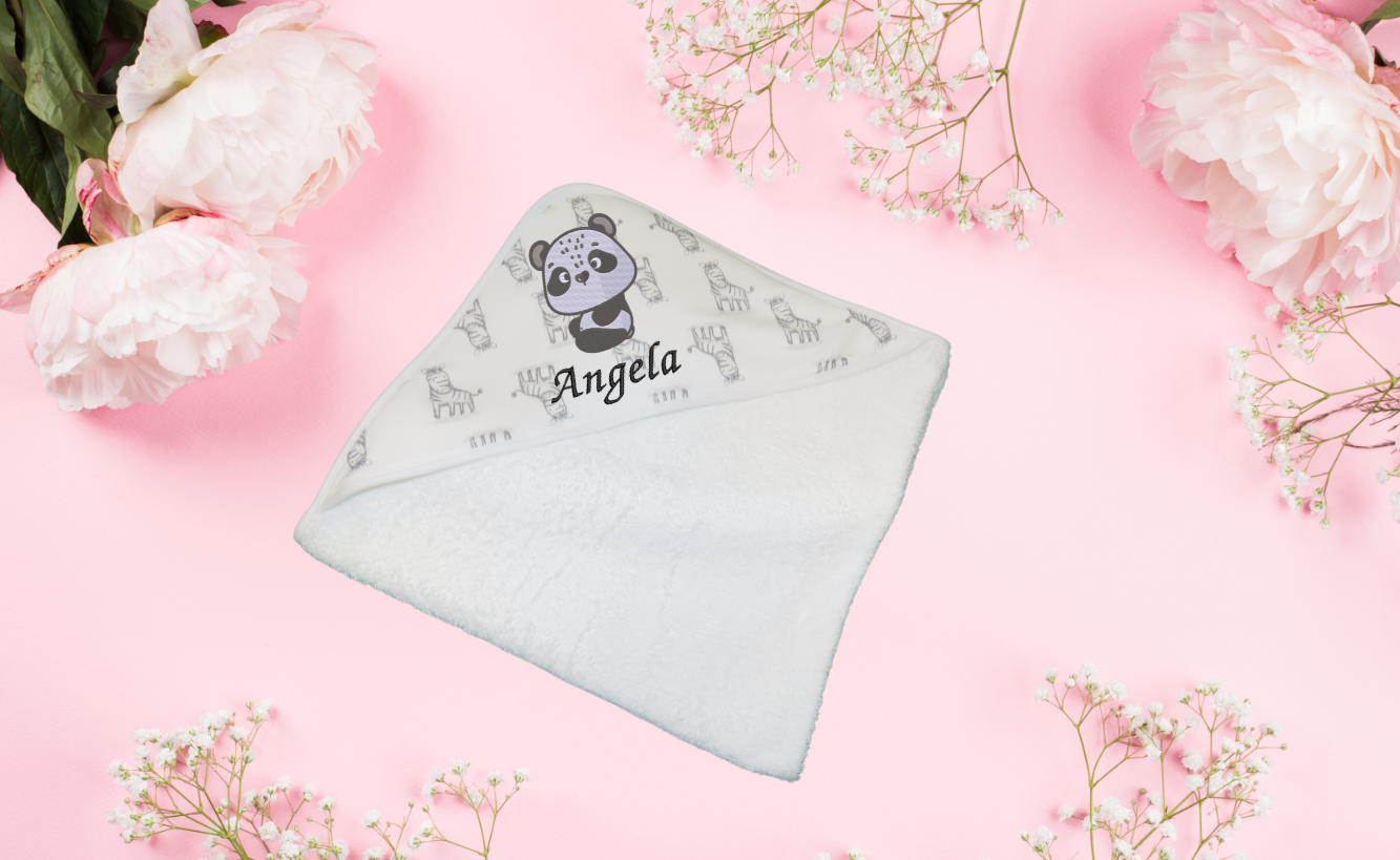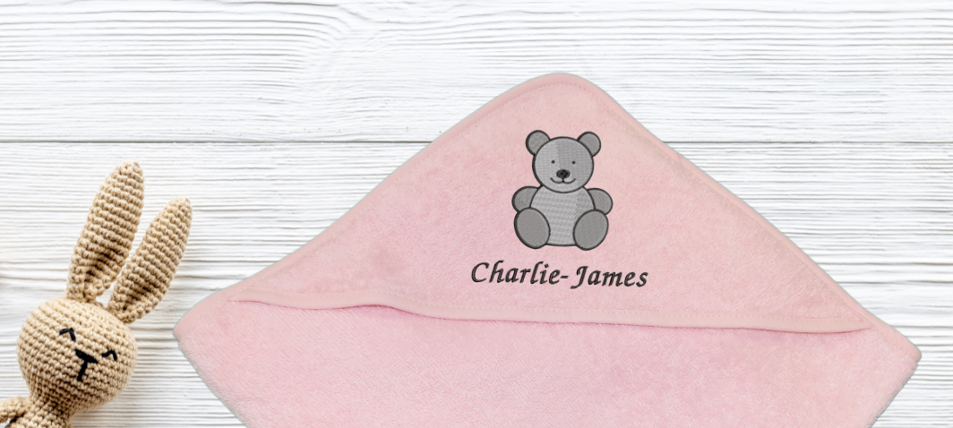 The Hooded Towel can be personalised with the precious babies name placed on the hood (Up to 20 characters and we will match the writing to the best scale for the item so please be aware that if the name is long or hyphenated the writing will be smaller than a short name like Rosie). You can then add a design from the options available. The embroidery area is approx. 8x8cm.