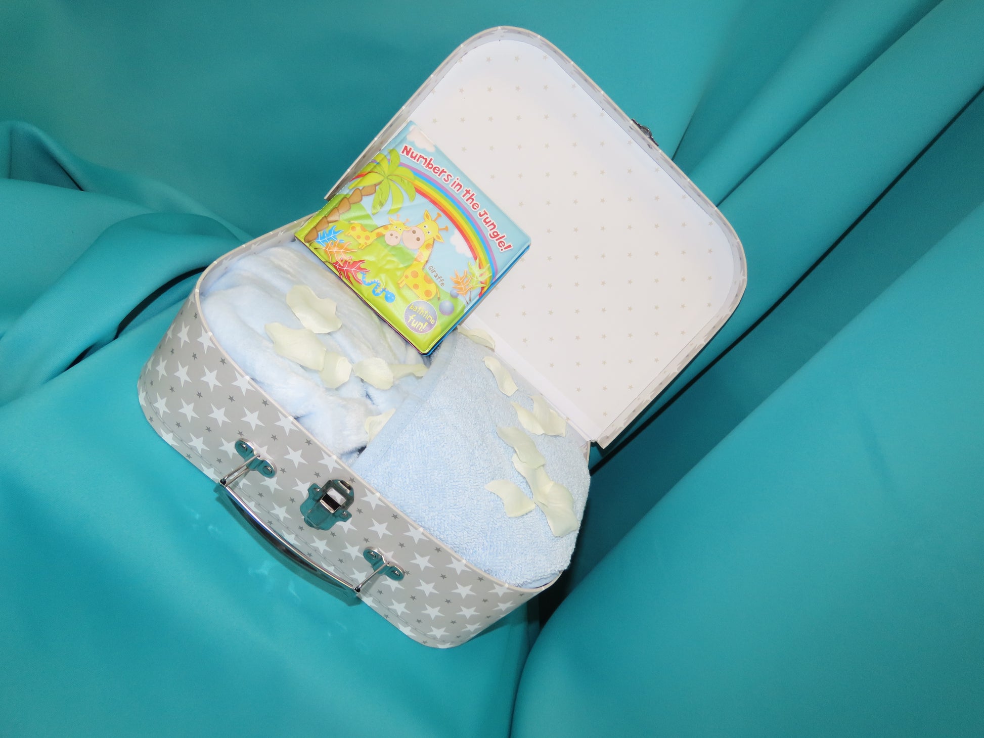 The Suitcase is made from recycled cardboard with a lovely Star design and features a small silver carry handle and secure metal clasp fastening. Depending on the set the case may not close with all the items in it so we will present the items and case in cellophane. It will be an amazing way to store babies keepsakes as they grow older.