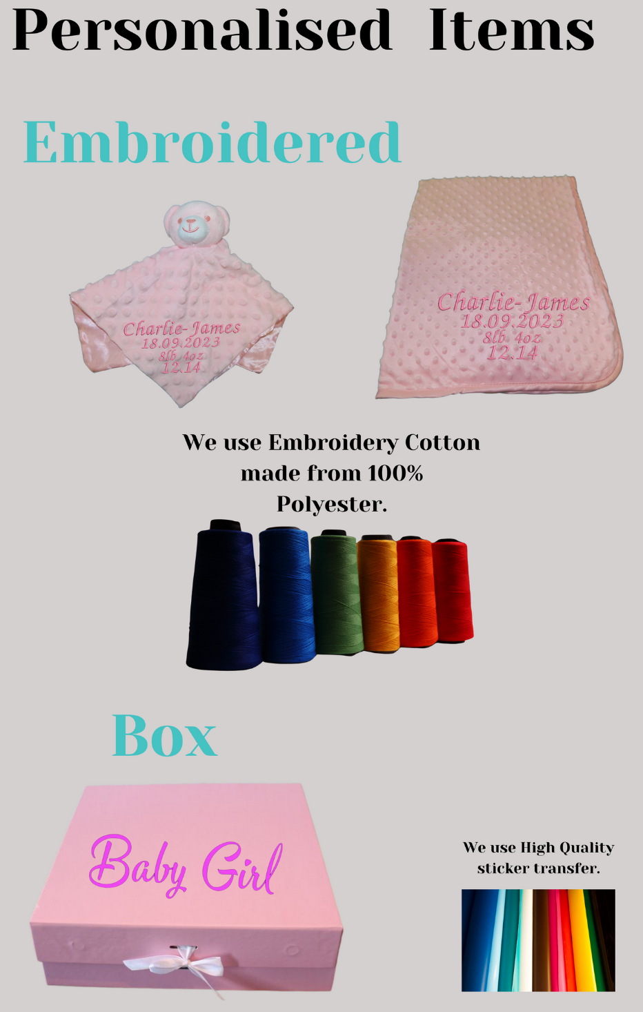 To make your gift extra-special, we can add the babies name, date of birth, time of birth and weight of the baby to the gift box. Please check your spelling of the name and other details carefully, it will be personalised exactly as entered. If preferred your box not to be personalised, please enter NONE in the personalisation field.